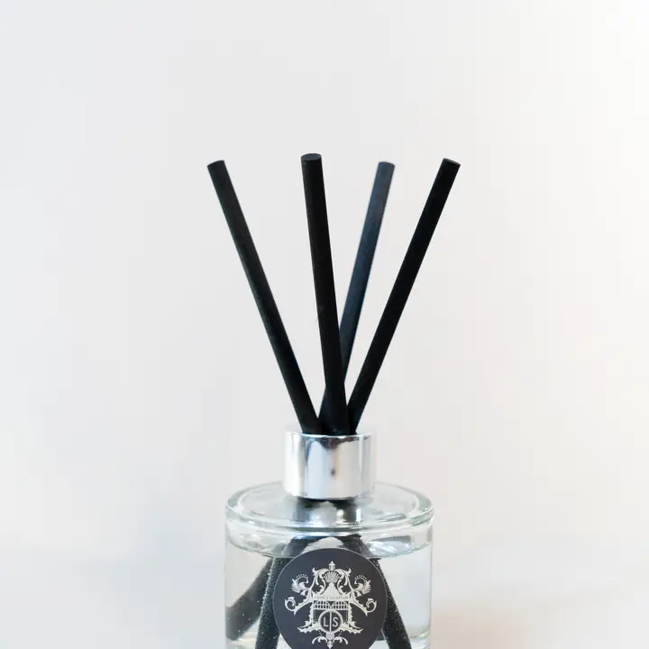 Diffuser Riet - ronde glazen fles van 100 ml met 4 zwart rieten sticks voor een geurverspreiding tot 12 weken.